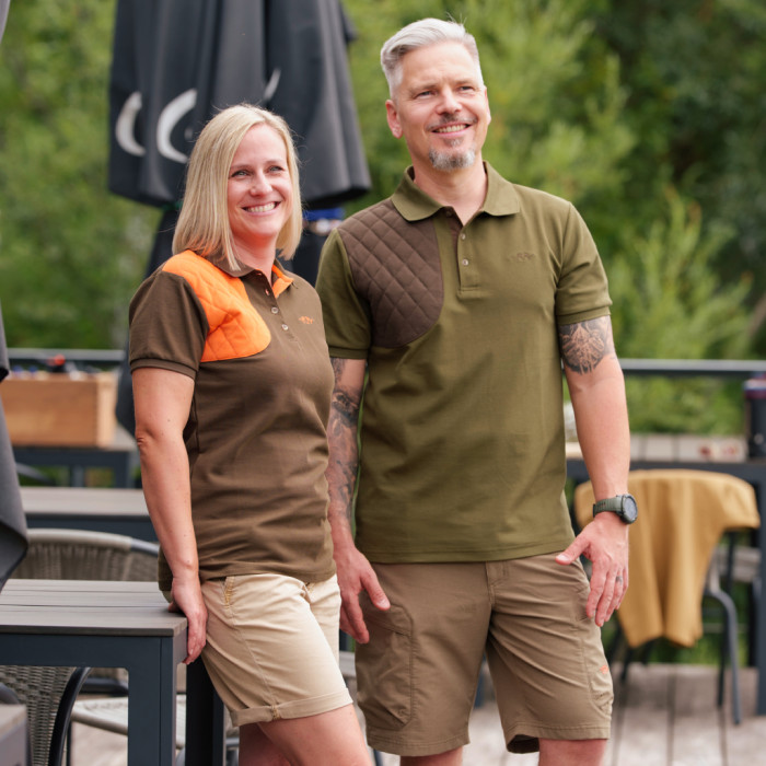 Dámská polokošile v hnědé barvě s oranžovou nášivkou ve tvaru střelecké výztuhy je ušita ze směsi bavlny s polyesterem. Polokošile má límeček a légu se čtyřmi knoflíčky. Vnitřní léga je ve stejné, oranžové barvě jako výztuha. Dolní okraj polokošile zdobí krátké boční rozparky oranžově podšité. Jedná se o kousek, který ráda oblékne nejen každá milovnice střelby a značky Blaser.