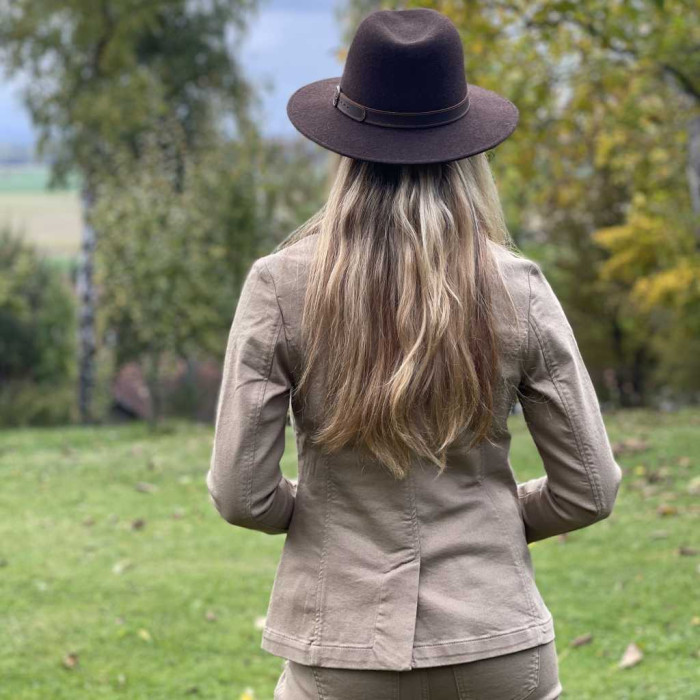Pískové, sportovně elegantní dámské sako je ušité ze strečového denimu. Projmutý střih, klopy, knoflíčky na rukávech a zadní rozparek dodávají saku eleganci. Použitý pružný materiál a doplňky v camo designu naopak ladí sako sportovně. Proto je jeho využití opravdu široké. Hodí se do kanceláře, na jednání, ale i pro lehkou outdoorovou aktivitu. Podšívka v kamufláži a na ní našitá exkluzivní etiketa je jen v zadní horní části saka. Sako má dvě přední výpustkové kapsy. Použité knoflíky zdobí loga Argali. Výšivka Argali je na dolní přední kapse. Toto sako se perfektně se hodí ke kalhotám Susan ze stejné kolekce. Nabízíme také v tmavě olivové barvě.